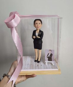 Đây là tượng doll vẽ tả thực, được các bạn học viên đặt làm quà lưu niệm ngành y. Bác sĩ mặc chiếc áo somi trắng cùng quần tây đen bên ngoài khoác chiếc áo blue trắng thường cho ta cảm giác chuyên nghiệp và trang trọng. Áo somi trắng và quần tây đen là bộ đồ cơ bản và truyền thống trong y tế, thể hiện sự chuyên nghiệp và sự tôn trọng đối với nghề của bác sĩ. Chiếc áo khoác blue trắng thường được bác sĩ thêm vào để bảo vệ quần áo và giữ cho bản thân luôn sạch sẽ trong quá trình làm việc. Áo khoác có thể được làm từ vải chống thấm nước hoặc vải đặc biệt để chống lại các tác nhân ô nhiễm trong môi trường làm việc của bác sĩ. Tượng được dựng trên chiếc đế nhựa giả gỗ vô cùng cứng cáp giúp tượng được đứng vững hơn.
