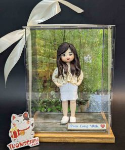 – Miêu tả sản phẩm: Tượng chibi quà tặng sinh nhật người yêu ý nghĩa, độc đáo. Đây là bộ tượng chibi 2D làm theo ảnh thật, cô gái tóc dài dễ thương mặc váy jean khoác chiếc áo màu kem cùng đôi giày bata được làm chi tiết dễ thương. Tượng có đế gỗ giúp tượng đứng vững, kèm nắp hộp mica dễ dàng làm quà tặng.