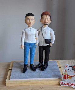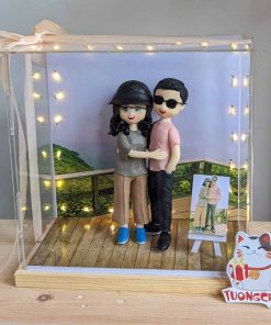 Bộ tượng được nặn bằng đất sét, với độ bền vô cùng cao rất thích hợp để làm quà tặng 8.3 quốc tế phụ nữ ý nghĩa nhất, bộ tượng phía trên là tượng chibi, một người bà trong chiếc đầm dài caro màu đen tay cầm một bó hoa có thể tạo ra một ấn tượng của sự sang trọng và thanh lịch. Đầm dài caro màu đen thường được xem là một kiểu dáng truyền thống và đầy nữ tính, đồng thời cũng mang lại cho người mặc một vẻ ngoài tinh tế và quý phái. Chiếc đầm có thể có thiết kế đơn giản nhưng vẫn mang lại sự đẳng cấp và lịch sự, người bà này có thể có vẻ ngoài rất trang nhã và cổ điển, với phong cách trang điểm và kiểu tóc đơn giản nhưng tinh tế. Tuy nhiên, bó hoa trong tay của bà có thể thể hiện tính cách nghị lực, tươi vui và tràn đầy sức sống của người phụ nữ này. Bó hoa cũng có thể là một chi tiết thêm vào trang phục, tạo ra một sự tương phản thú vị với màu sắc đen của chiếc đầm, các phụ kiện của người bà này có thể là một đôi giày cao gót, một chiếc khăn quàng cổ mỏng hoặc một chiếc vòng tay đơn giản. Những phụ kiện này thường có thiết kế tối giản nhưng vẫn rất thanh lịch và hiện đại, một người ông mặc chiếc áo somi xanh cùng chiếc quần tây xám có thể tạo ra ấn tượng của sự trang trọng và lịch lãm. Áo somi xanh có thể là một kiểu cổ điển và truyền thống, mang lại cho người ông sự nghiêm túc và chuyên nghiệp. Chiếc quần tây xám cũng đem lại cho người ông một vẻ ngoài lịch sự và chỉn chu. Kế bên cso kèm theemkhung ảnh nhỏ và cả khung lời chúc, phía sau có background và tượng được dựng trên chiếc đế nhựa giả gỗ vô cùng cứng cáp và kèm cả khung mica trong suốt giúp bảo vệ tượng.